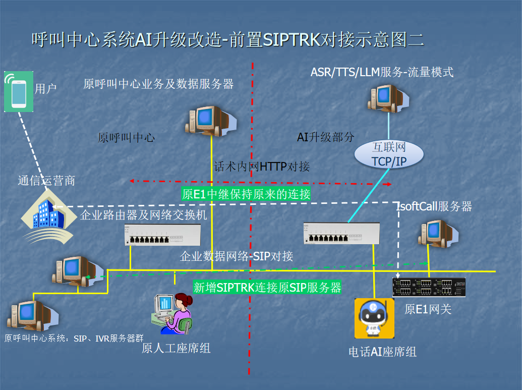 在气象局机房或政务云上部署iSoftCall服务器,通过SIP trunk对接原有中继线路或直接使用SIP外线。若需保留原有IVR,可旁路接入。
