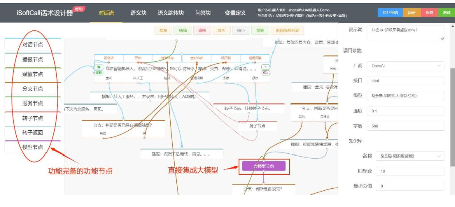 电话机器人的核心是“话术流程”——用户说什么,机器人怎么回,什么时候转人工,什么时候查数据库。传统模式下,这些逻辑需要开发人员用代码实现。一个中等复杂度的机器人,代码量动辄几千行,调试起来让人头大。